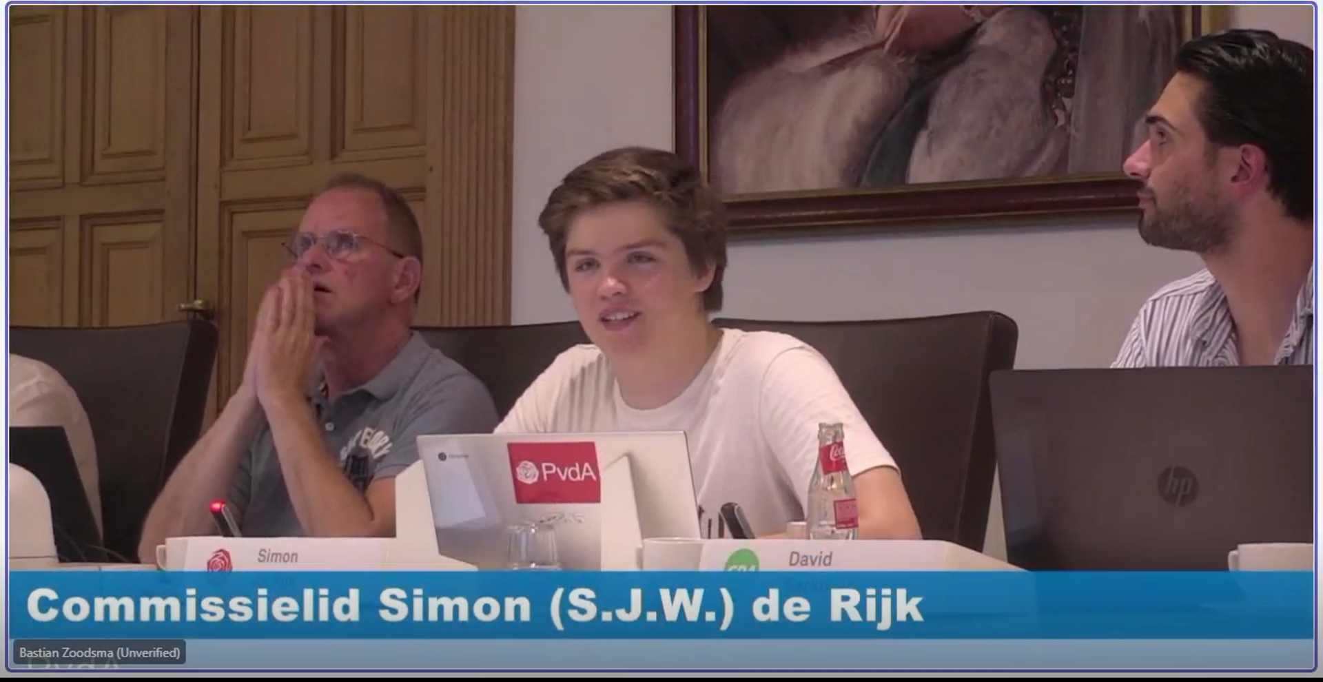 Commissielid Simon de Rijk zit met een chromebook voor zich, pratend, aan de raadstafel en kijkt naar rechts.